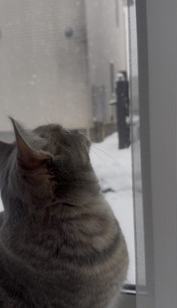 窓辺から離れず空から降ってくる白い物体をずっとみていました🐱