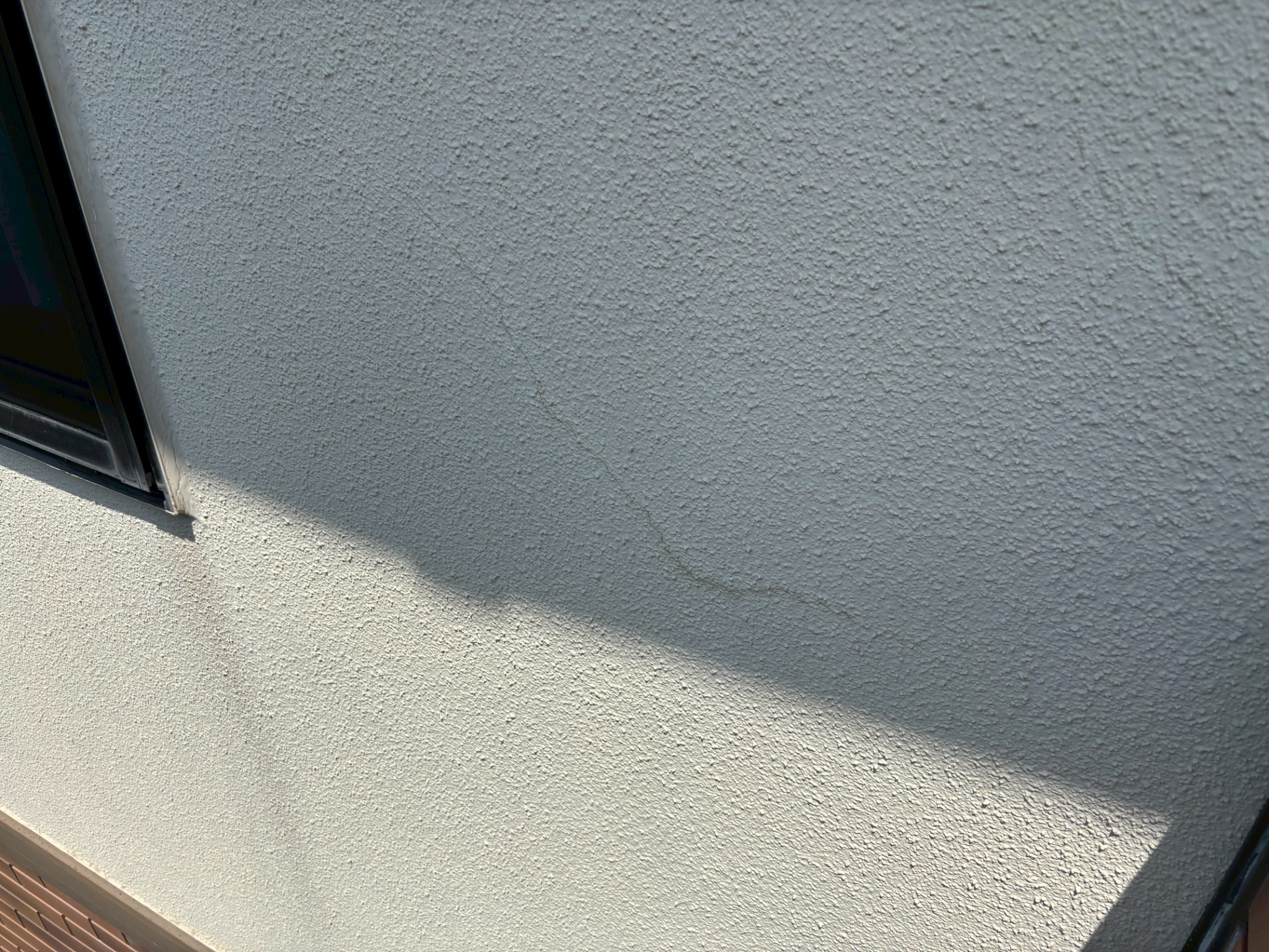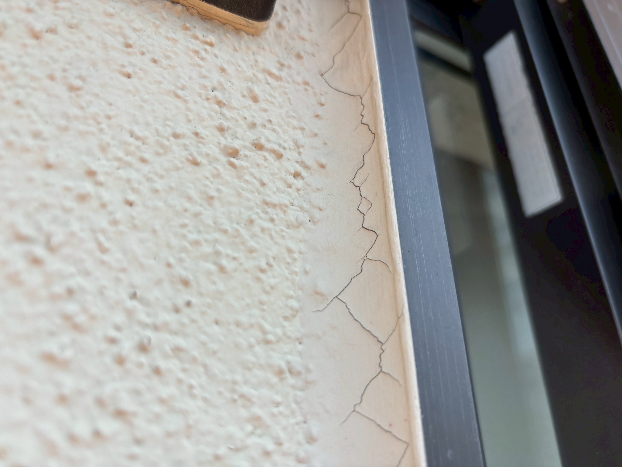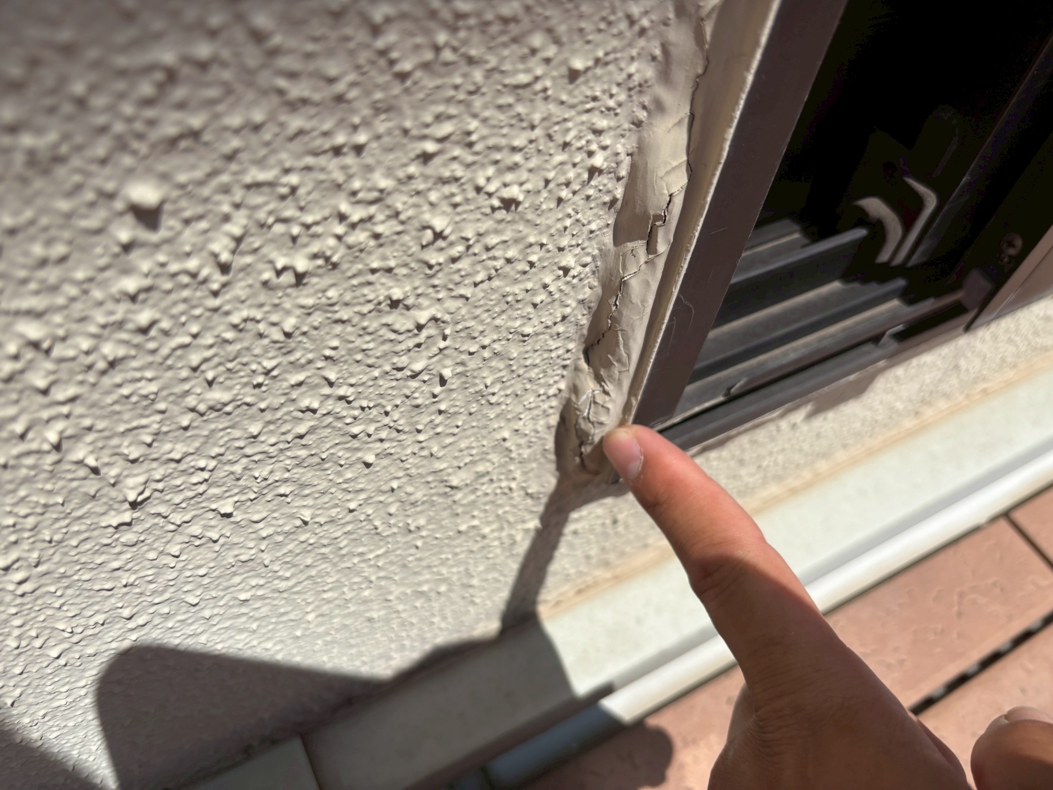 施工前の外壁の状態:経年劣化による、コーキング部分のひび割れが目立ちます。